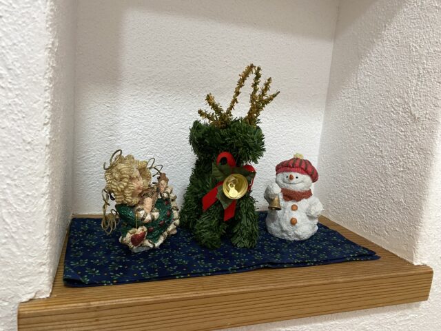 真っ白な漆喰壁と間接照明のやわらかい光に、クリスマスデコレーションがとてもよく映えます。