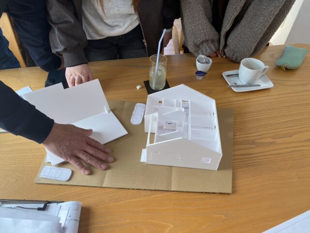平屋の住まいの模型をお客様と一緒に確認しました。