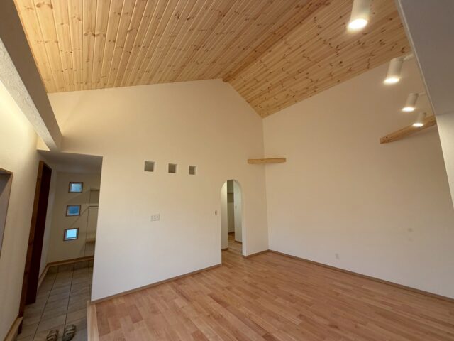 こちらもレッドウッドの勾配天井で開放感のあるリビングには、ピアノも置く予定とのことです。
