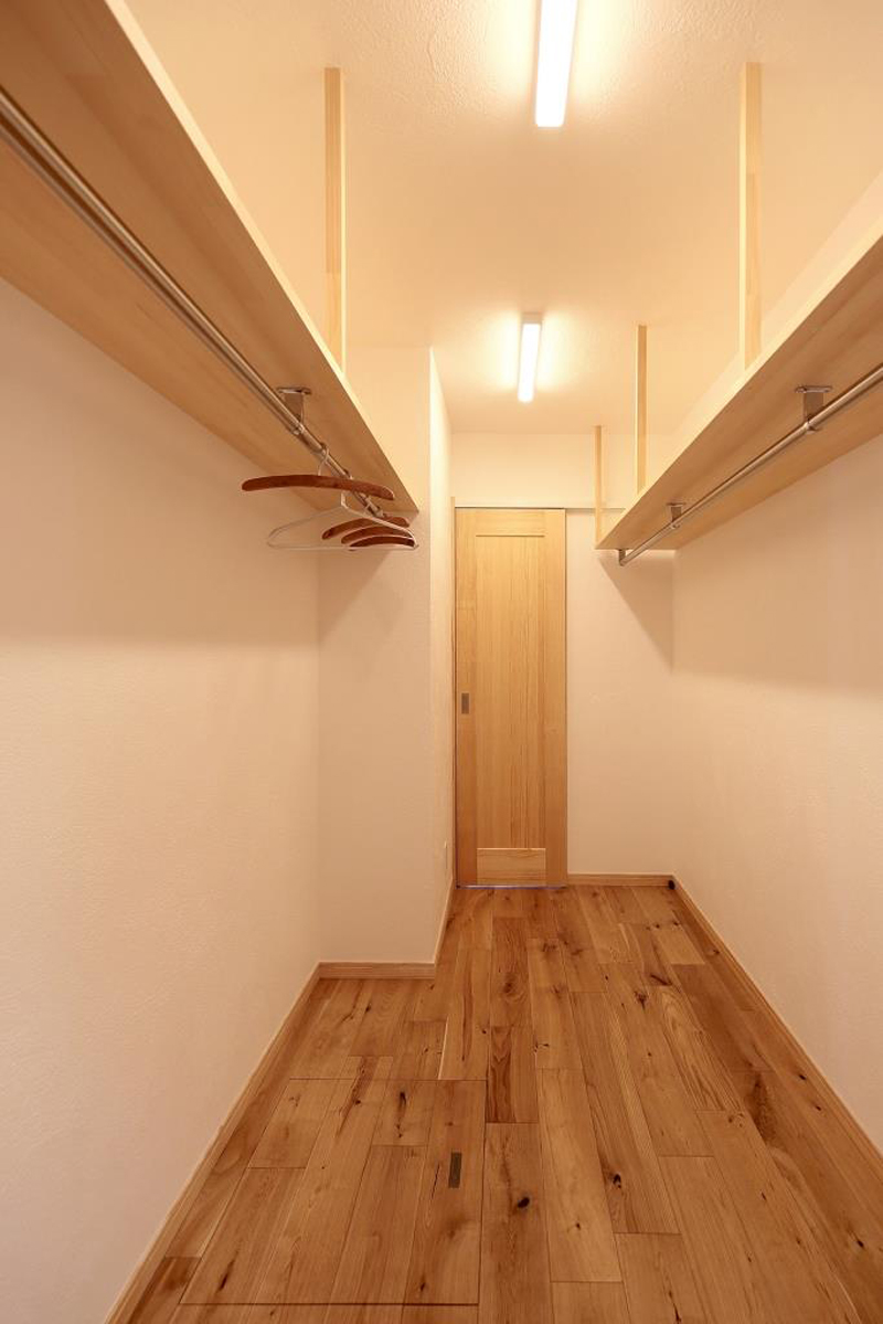 モデルハウスを見学して頂いた際に吉野杉でできたダイニングテーブルと障子を気に入っていただき、そのままプランに取り入れました。「回遊式の間取りで収納も多く、便利で住みやすいです」とお施主様。幹線道路沿いに建つので洗濯ものが見えにくいよう、木の柵を設置。かつ、干す+しまうが便利な間取りとしました。2階の書斎の奥に壁一面にたくさんの本を収納できる書庫を設置し、家族の図書館としてワクワクする空間となりました。ひとりになってリラックスできる空間も設置。薪ストーブも取り入れ、ただ座っているだけでも心地よい癒しの空間が実現しました。