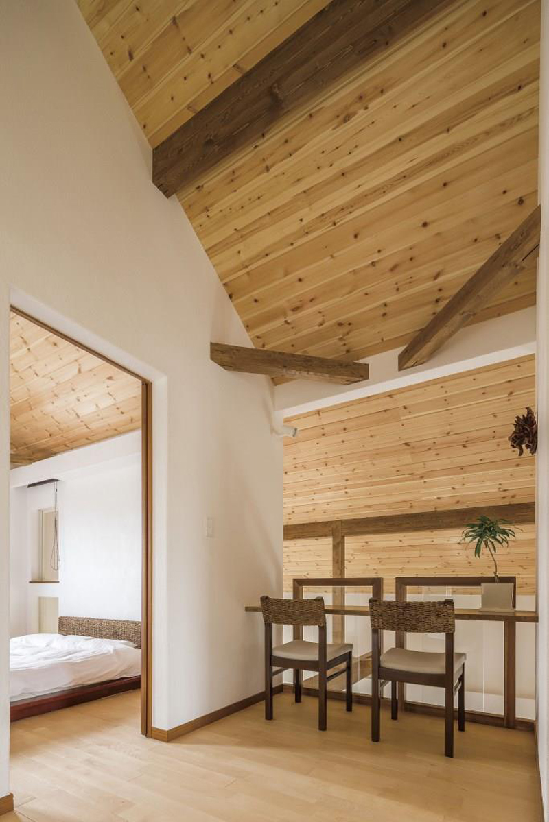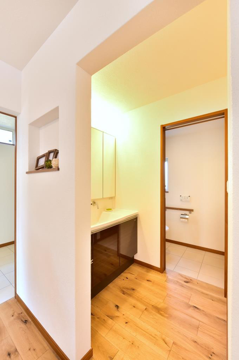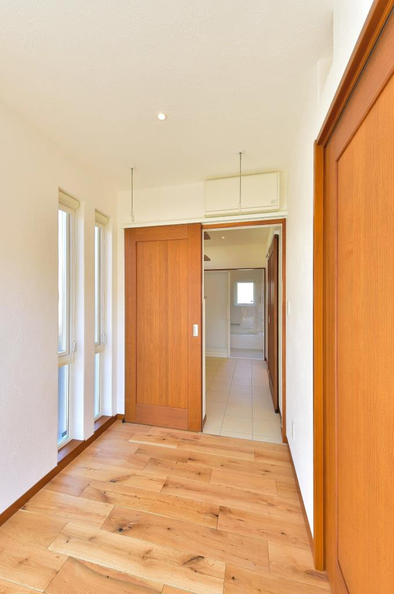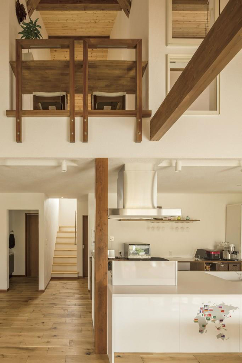玄関からリビングに行く動線に写真や思い出の品を並べたギャラリーコーナーを設置しました。アジアンリゾートのような雰囲気をご希望で、室内の一部を落ち着きのある深い茶色で仕上げ、漆喰の白い壁と木材の色のコントラストが美しい住宅です。イタリアのカフェのような赤い屋根が特徴のウッドデッキでは家族や友人とBBQを楽しめます。