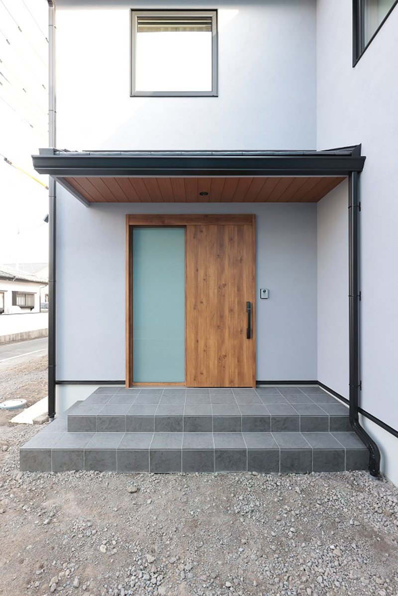 グレーの外壁にブラックサッシが映えるグレーの漆喰を使った家