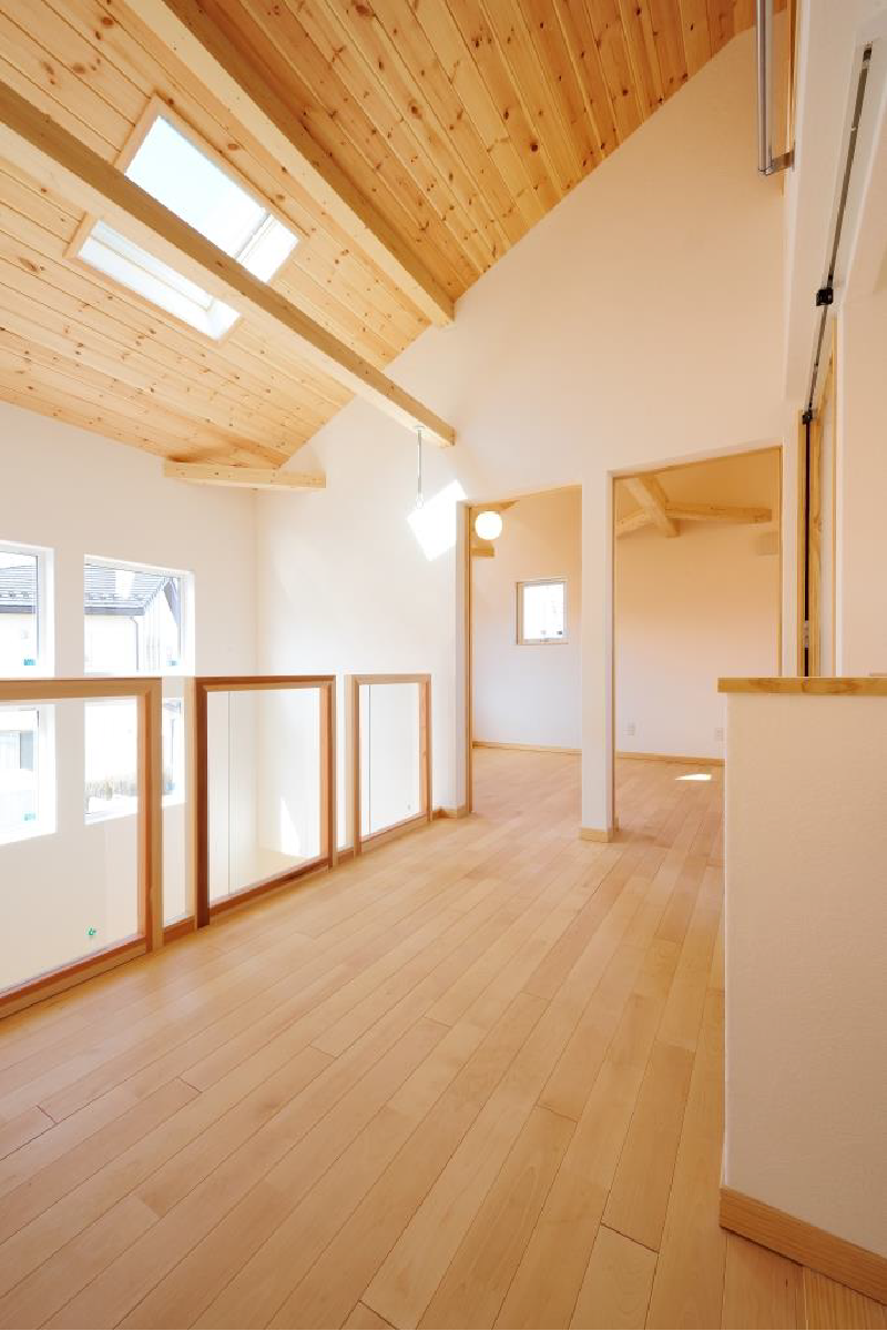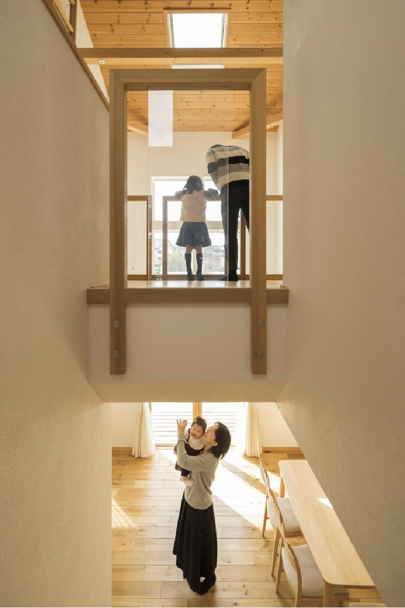 篠田工務店の外観デザインの可愛らしさと、無垢と漆喰をふんだんに使用した家づくりをしていることが決め手だったというお施主様。土地購入時に東面、南面の日差しが確保しにくい土地であるので日影図を作成しました。1階は日陰になることをご理解のうえ土地を購入されました。当初は2階リビングをご提案しましたが、やはり1階リビングが良いとの事で設計コンセプトを【in the sun】として明るい空間をご提案しました。
