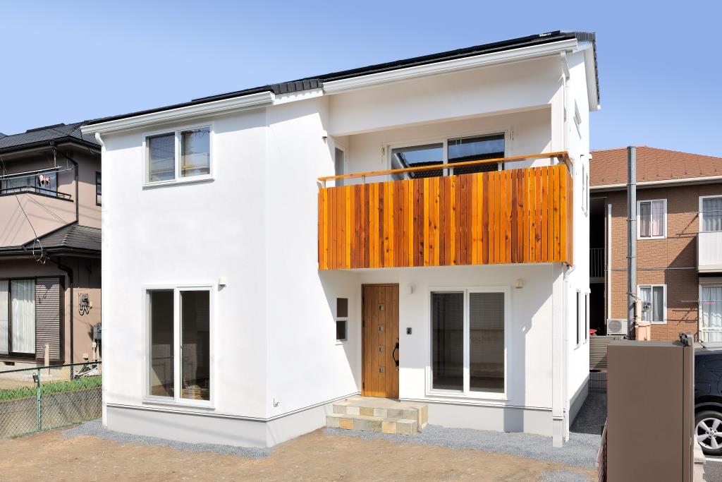 住宅街に建つ木造2階建て(小屋裏収納付)住宅。南側道路と東側隣地駐車場が抜けのポイント。