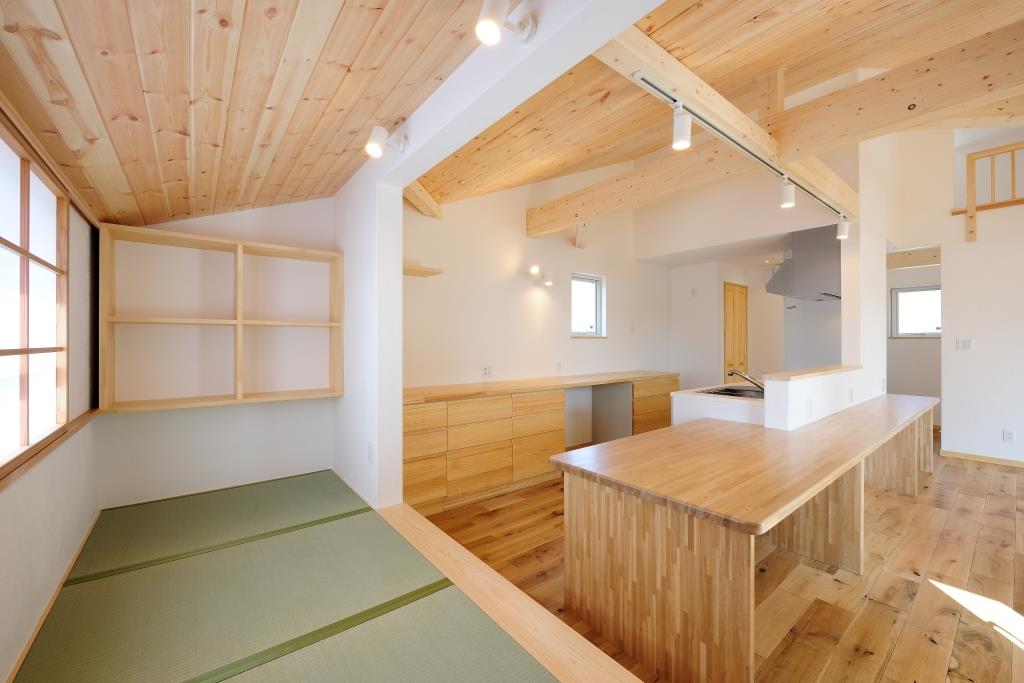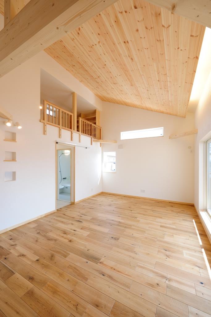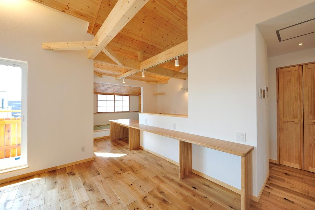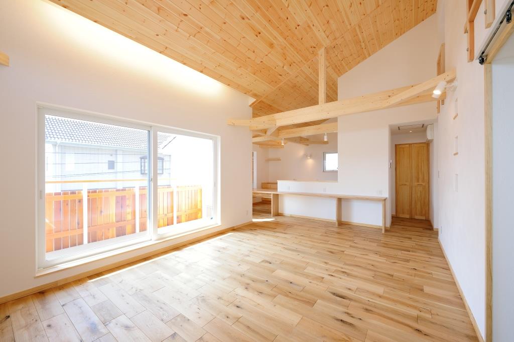 周りを住宅で囲まれていることから1階をプライベートゾーンとしました。1階の収納スペースとして、玄関クローク、WIC、廊下を利用した収納を確保。ただいま洗面を設け、帰宅時の手洗い・うがいの場としました。1階の明るさの演出として階段をスケルトン階段としました。抜け感を出すためLDKは勾配天井とし、さらに小屋裏部分を繋げました。LDKを2階にすることによって外部からの視線を気にすることなく落ち着いた空間を演出することができました。