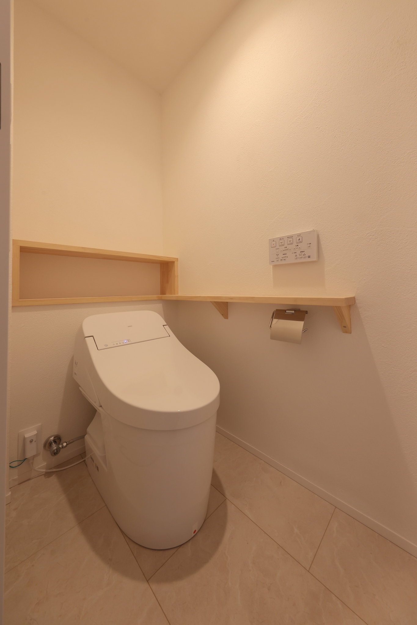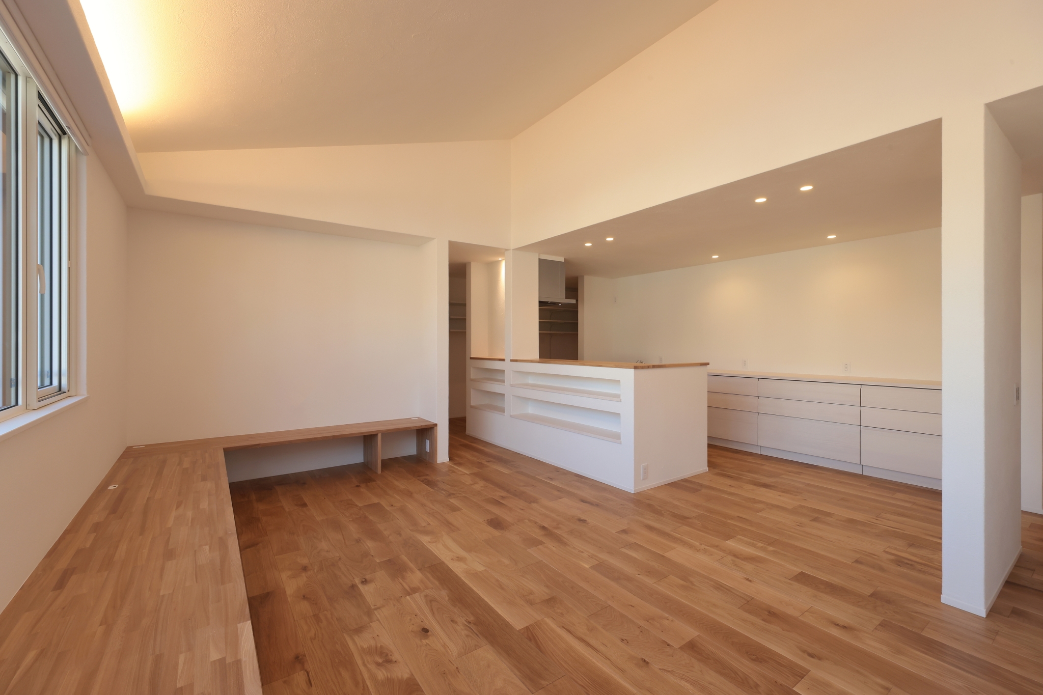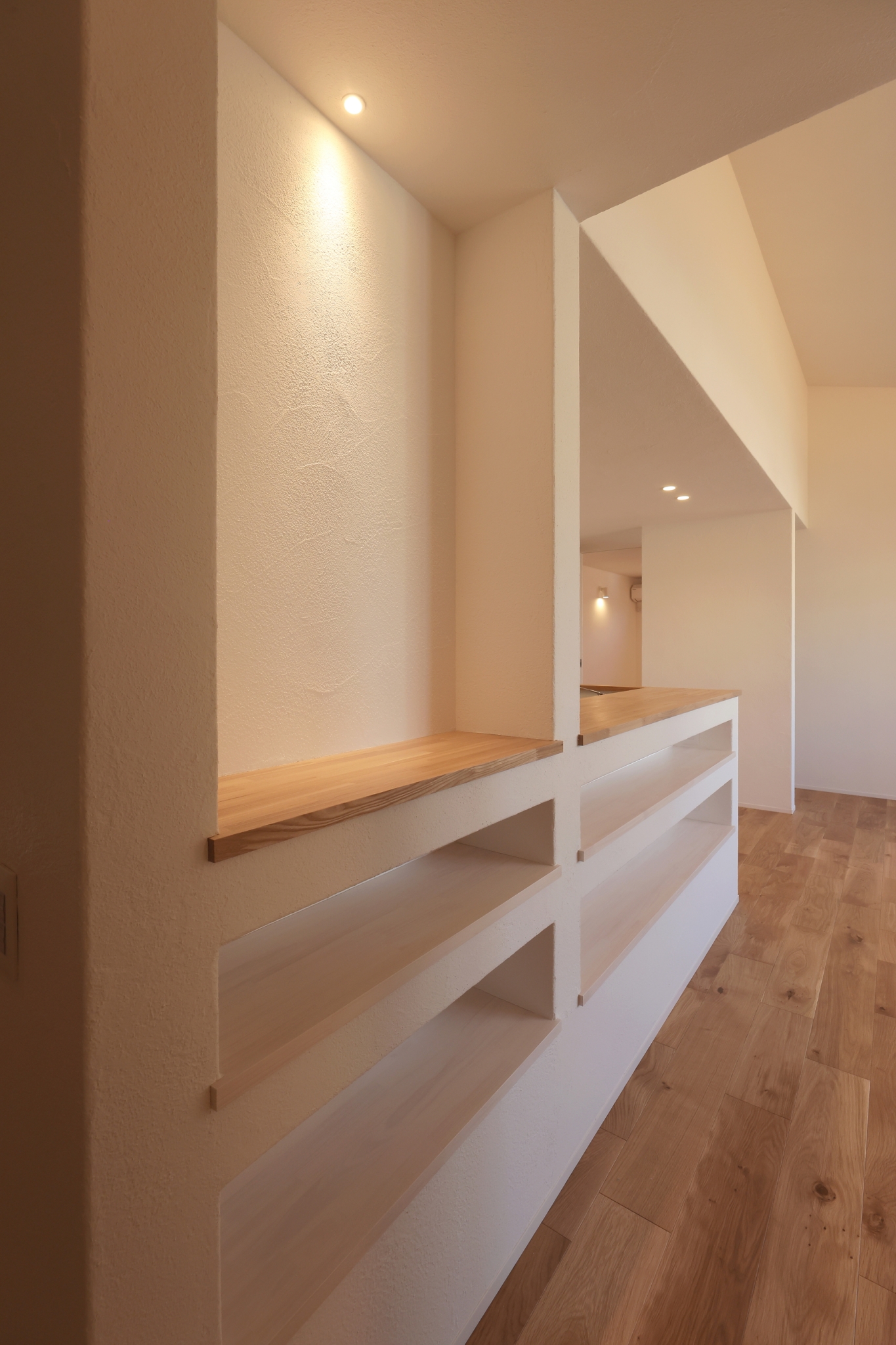 お家のどこにいても心地よさを感じられる「居場所が多いお家」局所照明を主とした照明計画は漆喰の反射で空間に柔らかさを与えます。特にリビングの間接照明は天井を漆喰の勾配にしたことにより天井に光が伸び、広がりを感じさせます。北側向きのリビングでも自然光と漆喰が融合し、明るく快適な空間になっています。生活動線も考慮し、各方向から行き来できる回遊型にすることで移動しやすく、家事もしやすい暮らしを実現しています。断熱・気密の高い機能性、漆喰・無垢材の自然素材による建物は、1年を通して心地よくお住いいただけます。各担当者が強いこだわりをもつ「しのだ工務店」だからこそ実現できた、とても素敵なお家です。